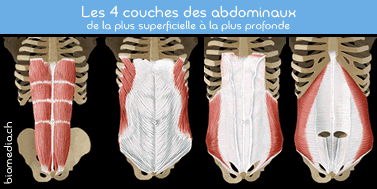 La sangle abdominale regroupe les muscles qui tapissent la face antérieure de l'abdomen entre les côtes en haut et la symphyse pubienne et le bord antérieur du bassin en bas. Elle se compose de 5 muscles paires et symétriques du plus profond au plus superficiel :