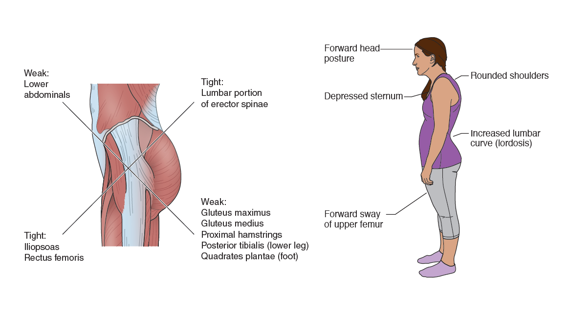 Caractérisé par une hyperlordose lombaire, une hyperextention des genoux et une posture en avant de la tête, elle est due à un déséquilibre entre les muscles abdominaux et glutéaux (faibles) et les quadriceps et psoas et extenseurs du rachis (forts) Cette posture augmente les contraintes subies par les articulaires postérieures des vertèbres lombaires. En plus des problématiques liées à la posture tête en avant, elle augmente également le risque de pincement discal, d’arthrose articulaire postérieure et interépineuse lombaire, mais augmente aussi considérablement les tensions au niveau des épaules et des cervicales.